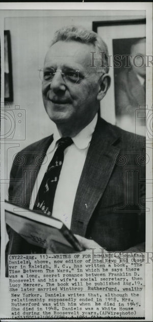 Writes of FDR Romance - Johnathan Daniels, above, now editor of the News and Observer in Raleigh, N.C., has written a book, "The Time Between The Wars," in which he says there was a long, secret romance between Franklin D. Roosevelt and his wife's social secretary, then Lucy Mercer. The book will be published Aug. 19. She later married Winthrop Rutherfurd, wealthy New Yorker. Daniels writes that, although the relationship supposedly ended in 1918. Mrs. Rutherford was with him when he died in 1945. She died in 1948. Daniels was a White House aid during the Roosevelt years.
