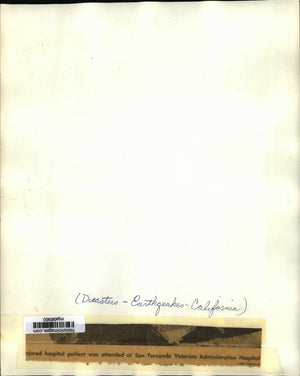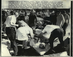 Disasters-earthquakes-California. Injured hospital patient was attended at San Fernando Veterans Administration Hospital. Nurses and firemen attend to a patient that was injured when a building collapsed on patients and hospital workers at the Veterans Administration Hospital during an earthquake that struck the Southern California area. Early reports stated that seven patients had been killed at the hospital, but rescue workers were looking for a large number of people reported trapped under the wreckage.