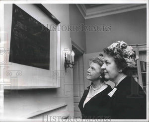 A painting by Dean Meeker, professor of art and art education at the University of Wisconsin and a widely known artist, was admired during the tea Wednesday at the governor's mansion by Mrs. John Burr Williams (left), Wellesley Hills, Massachusetts, and Mrs. Conrad A. Elvehjem. wife of the university's late president. Mrs. Williams' husband is a visiting professor in the University of Wisconsin school of commerce.