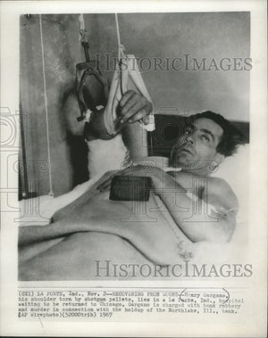 Henry Gargano, his shoulder torn by shotgun pellets, lies in a La Porte, Indiana, hospital waiting to be returned to Chicago. Gargano is charged with bank robbery and murder in connection with the holdup of the Northlake, Illinois bank.