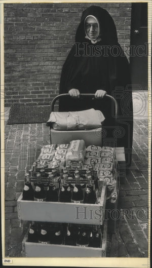 1963 Press Photo Sister Dorothy wheels in foodstuffs gathered in one morning