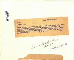TOPEKA KANSAS: A gasoline fire added to the flood threat today when a gasoline storage tank at Phillips Petroleum Company exploded. The fire is in the background surrounded on four sides by water. Flames drifted down the Kansas river and threatened houses along the bank.