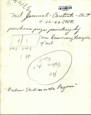 Milwaukee Journal, contests, art. Purchase prize painting by Mrs. Rosemary Kraynic of Milwaukee. Onbow Studios in the Lagoon.