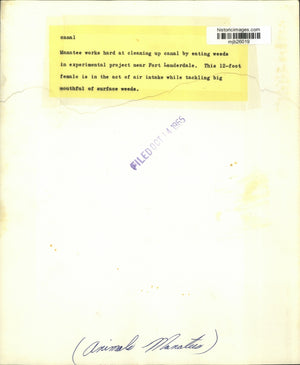 Manatee works hard at cleaning up canal by eating weeds in experimental project near Fort Lauderdale. This 12-foot female is in the act of air intake while tackling big mouthful of surface weeds. (Animals - Manatees)