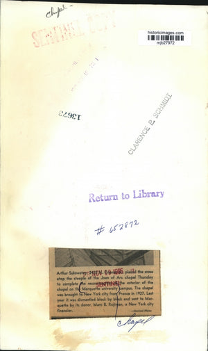 Arthur Sukowatey 2435 North Cramer, placed the cross atop the steeple of the Joan of Arc chapel Thursday to complete the reconstruction of the exterior of the chapel on the Marquette University campus. The chapel was brought to New York City from France in 1927. Last year it was dismantled block by block and sent to Marquette by its donor, Marc B. Roitman, a New York City financier. Milwaukee