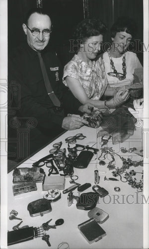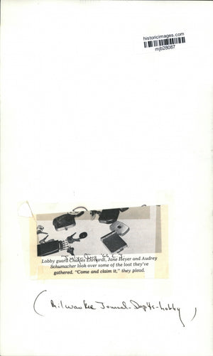 Lobby guard Charles Ehrhardt, Jane Heyer and Audrey Schumacher look over some of the loot they've gathered. "Come and claim it," they plead. Milwaukee Journal Departments - Lobby