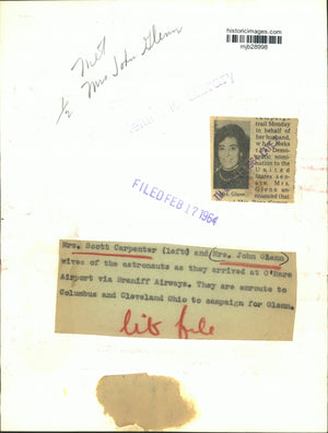 Campaign trial Monday in behalf of her husband, who seeks the Democratic nomination to the United States senate, Mrs. Glenn announced. Mrs. Scott Carpenter (left) and Mrs. John Glenn wives of the astronauts as they arrived at O'Hare Airport via Braniff Airways. They are enrout to Columbus and Cleveland Ohio to campaign for Glenn.