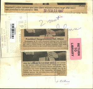President Lyndon Johnson and John Glenn enjoyed a hearty laugh after Glenn was promoted to full colonel in 1964. A White House rose garden ceremony that made Glenn a full colonel in the United States marine corps. The promotion was made despite Glenn's request that he be passed over because of his impending retirement from military service. He will soon join a soft drink company in an executive position.