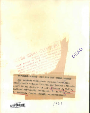 Informal moment for Big Ten commissioner New Western Conference commissioner Bill Reed stands between Indiana and Purdue officials April 24 in Chicago. At left, Herman B. Wells, Indiana University President; at right, Vern C. Freeman, Purdue faculty representative. Dead