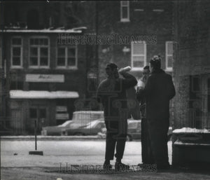 1975 Press Photo Three men on snow packed street corner smoking and drinking, WI