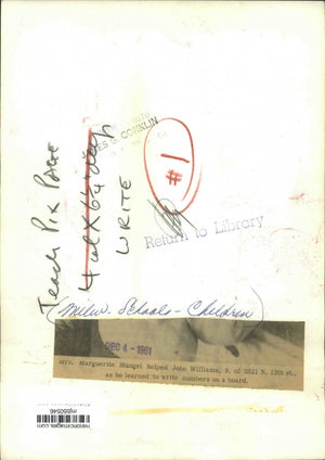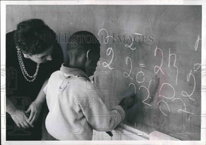 Mrs. Marguerite Stangel helped John Williams, 9, of 3321 North 12th Street, as he learned to write numbers on a board.Milwaukee Schools