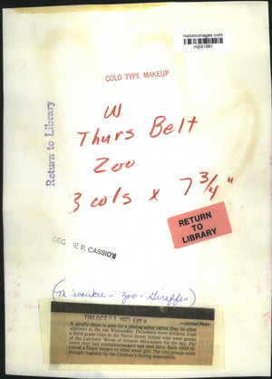 A giraffe chose to pose for a photographer rather than its other admirers at the zoo Wednesday. Onlookers were children from a third grade class at the Pierce Street School who were guests of the Lawyers' Wives of Greater Milwaukee for the day. Milwaukee - Zoo - Giraffes. Thursday Belt Zoo.