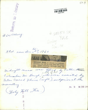 Holy Hill Wisconsin Midnight mass, on channel 4 at midnight, Christmas eve, will be from Holy Hill monastery. Father Columban McGough (left), the prior, will be celebrant. Midnight mass was offered by father Columban McGough, who was assisted by father Conrad Thise (right), sulprior at the monastery.