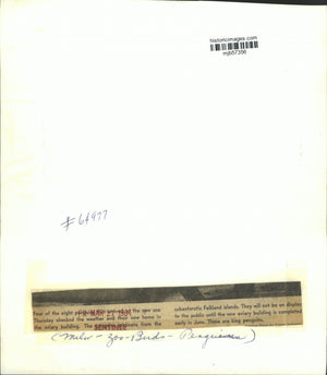 Four of the eight penguins that arrived at the new zoo Thursday checked the weather and their new home in the aviary building. The penguins originate from the subantarctic Falkland islands. They will not be on display to the public until the new aviary building is completed early in June. These are king penguins. (Milwaukee - Zoo - Birds - Penguins). Wisconsin.