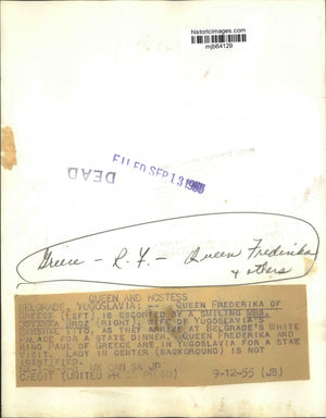Greece-R.F.- Queen Frederika & others Queen Frederika of greece (Left) is escorted by a smiling Mrs. Jovanka Broz (Right) Wife of Yugoslavia's Marshal Tito, as they arrive at Belgrade's White Palace for a state dinner. Queen Frederika and King Paul of Greece are in Yugoslavia for a state visit. Lady in center (background) is not identified.