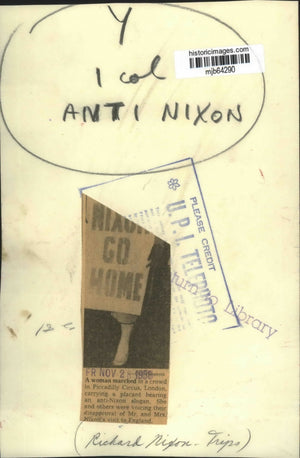 A woman marched on a crowd in Piccadilly Circus, London carrying a placard bearing an anti-Nixon slogan. She and others were voicing their disapproval of Mr. and Mrs. Nixon's visit to England.