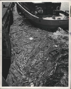 1958 Press Photo Fish & debris pollute Milwaukee River next to a Deluge boat