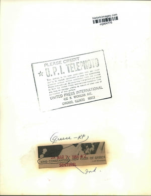 King Constantine - New Ruler of Greece. NXP/RLB1415-71-3/6/64- Athens, Greece: A somber Greek Crown Prince Constantine renders salute upon arriving at Tatoi Palace for oath-taking ceremony here 3/6, aftere his father, King Paul l, died. At 23 , Costantine is Europe's youngest royal ruler. Offical title of the new monarch is King Costantine ll of the Hellenes.