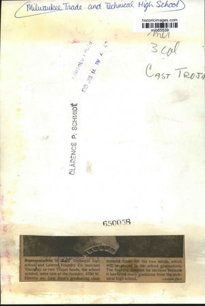 Representatives of Milwaukee Trade and Technical High School and Lawran Foundry Co. watched Thursday as two Trojan heads, the school symbol, were cast at the foundry, 4700 W. Electric av. Last June's graduating class donated funds for the two heads, which wil lbe placed in the school gymnasium. The foundry donated its services because it has hired many graduates from the technical high school .