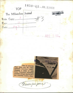 Then he pilots his Piper plane over the widely scattered ranches (right), dropping a paper at each house. Newspapers.