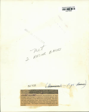 Kentucky razorbacks, semi wild descendants of hogs brought from Europe in America's frontier period, were received Monday at the Milwaukee stockyards. The boar and sow, and another boar, were sold by E.T. Schowalter of Jackson (Washington county) who had kept them on his game farm. The largest razorback weighed about 300 pounds. Pigs