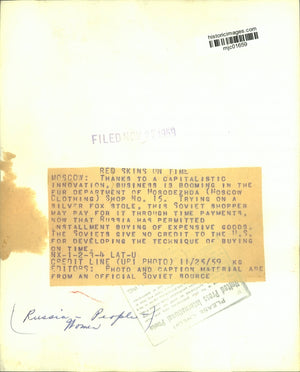Thanks to a capitalistic innovation, business is booming in the fur department of Mosodezhda (Moscow Clothing) Shop No. 15. Trying on a silver fox stole, this Soviet shopper may pay for it through time payments, now that Russia has permitted installment buying of expensive goods. The sofiets give no credit to the U.S. for developing the technique of buying on time.