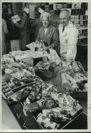 1967 Press Photo Mrs. George Scholzen And Erwin Beautin Pack Gift Box Sausages
