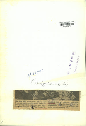 The night shift works from 8 p.m. to 4 or 5 a.m. during the pre-Christmas season to pack sausage which customers order daily from Fred Usinger, Inc. Mrs. George W. Scholzen, 7852 W. Hope av. night shift supervisor, and Erwin Beautin, 6501 W. Edgerton av., traffic manager, inspect gift boxes on the assembly line.
