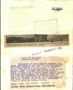 Untouched by the winds of progress the dusty corridors of the Tunisian Casbah (native quarters) remains the same. A stall merchant and a young boy sit in an alcove to read quietly among the bustling noises heard in the market place. A slight note of the modern world is seen with a beauty queen poster (above old man) which proves the Bedouins Arab men are like men throughout the world when it comes to pin-ups. Although the native women of the North African state are well concealed in yards of swirling draped fabric. (Tunisia - People)