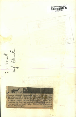 Laurian Cardinal Rugambwa, bishop of Bukoba, Tanganyika, arrived in Indianapolis Thursday for the 48th national convention of the Knights of St. Peter Claver, a Negro Catholic fraternal organization. Cardinal Rugambwa, the first Negro prince of the Catholic church, was greeted by Mayor Albert Losche and Archbishop Paul C. Shulte.