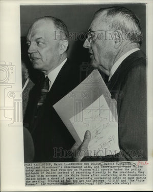Washington - Announce New Policy - Harold E. Stassen, President Eisenhower's disarmament aide, and Secretary of State Dulles today announce that from now on Stassen will operate under the policy guidance of Dulles instead of reporting directly to the president. They talked with newsmen at the White House after conferring with Eisenhower. Dulles holds a sheet of paper apparently containing notes he made during the meeting. Printed at the top are the letters "D D E" and "The White House." Harold E. Stassen.