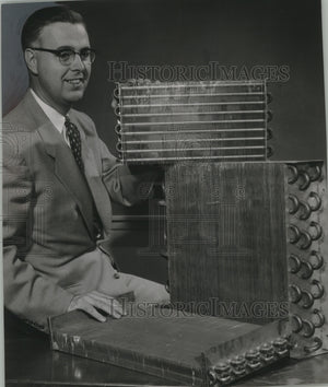 Coils for air conditioning equipment are now being manufactured by the Perfex Corp., Milwaukee. Shown with some of the company's new products is W. K. Watts, manager of a new refrigeration coils division. Perfex will make only the coils, not the entire air conditioning unit.