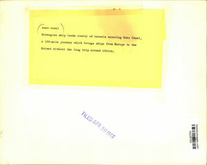 Norwegian ship leads convoy of vessels entering Suez Canal, a 100-mile journey which brings ships from Europe to the Orient without the long trip around Africa. Suez Canal