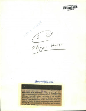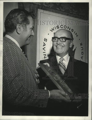 Milwaukee, WI: John E. Stipp (right) retiring president of the Federal Home Loan Bank of Chicago, received a plaque Friday at the midyear meeting here of the Wisconsin Savings and Loan League. The presentation, at the Pfister Hotel, was made by Walter E. Klunk, president of First Northern Savings and Loan Association, Green Bay, and president of the state league.