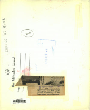 At General Motors test site in Michigan, this 27% grade proves work-ability of the cars' brakes and transmission. car on 27% grade incline at General Motors test site, Michigan