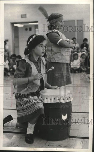 Jill Robertson, 8, of 555 W. Lamarie lane, Fox Point, beat a tom-tom while Mimi Bordow, 8, of 120 W. Indian Creek ct., led a song. --- (Indian Hill School)