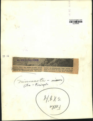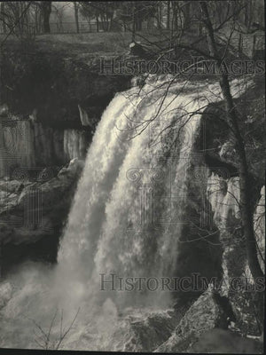 Swollen from a tiny trickle of water, famed famed Minnehaha falls produced a full throated roar recently in a Minneapolis park. The stream carried an exceptionally large amount of water as a result of rains and spring thaws which contributed to state flood conditions. Minnesota, cities, Minneapolis.