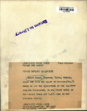 Topped Bowling Qualifiers -- Buddy Bomar, Houston, Texas, Kegler, rolls one down the alley in Chicago, December 11 where he led the qualifiers in the All-Star Bowling Tournament. In his first match in the finals Bomar got 1,151 pins in his six-game series. Filed December 15, 1942.