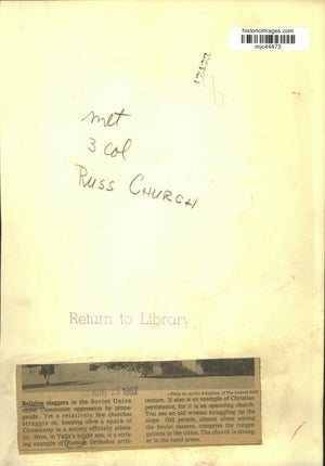 Religion staggers in the Soviet Union under Communist oppression by propaganda. Yet a relatively few churches struggle on, keeping alive a spark of Christianity in a society officially atheistic. Here, in Yalta's bright sun, is a striking example of Russian Orthodox architecture. It also is an example of Christian persistence, for it is an operating church. You see an old woman struggling up the slope. Old people, almost alone among the Soviet masses, comprise the congregations in the cities. The church is stronger in the rural areas.