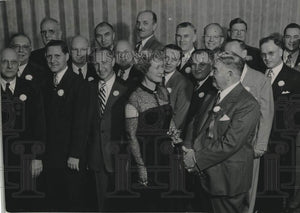 Saluting a quarter century of service, 21 members of the class of 1924 were welcomed into The Milwaukee Journal 25 Year Club at a dinner Wednesday night at the Athletic Club. Harry J. Grant, chairman of the board of The Journal Co. talked with Miss Elsie C. Eifler, the only woman member of the new class. Other forty-niners include (from left) Edwin G. Watts, Charles Stenger, Edward J. Walsh (back), Charles F. Yahn, Wallace MacIver, Arno R. Fischer, Lewis W. Herzog (back), George W. Kuenn, Leslie L. Guerndt, Harold Broetzmann, Edward F. Lang, George W. Jahnke, Thomas A. Lathrop, Victor L. Hansen (hidden), Irwin Maier, Edwin A. Koffke, Oliver E. Kuechle and Joseph C. Hanauer. Two members were unable to attend because of illness. The new members receive 25 year pins and medallions. Milwaukee Journal 25 Year Club