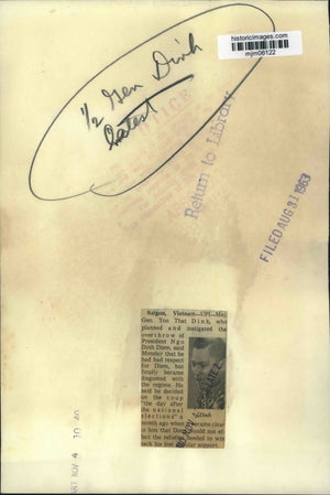 Vietnam War - Brigadier General Ton That Dinh, military governor of Saigon, Viet Nam since martial law was imposed August 20, tells a news conference there today that martial law will be lifted as soon as the Buddhist crisis is over. He said this would demand the cooperation of the foreign press and implied he wanted an end to news stories critical of the regime of President Diem. Major General Ton That Dinh, who planned and instigated the overthrow of President Ngo Dinh Diem, said Monday that he had had respect for Diem, but finally became disgusted with the regime. He said he decided on the coup "the day after the national elections" a month ago when it became clear to him that Diem would not effect the reforms needed to win back his lost popular support.