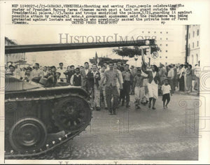 Caracas, Venezuela: Shouting and waving flags, people celebrating the ouster of President Marcos Perez Jimenez march past a tank on guard outside the Presidential palace, January 23. Tanks and troops encircled the plane, January 25, guarding it against possible attack by vengeful mobs. A government spokesman said the residence was being protected against looters and vandals who previously sacked the private home of Perez Jimenez (Caracas, Venezuela)