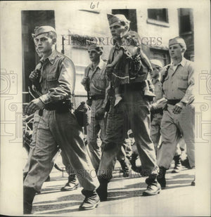 Korean War, United States Troops in America: Postponing parting from her father, Brenda Fay Souris, 14 months, nestled against Staff Sergeant G. S. Souris, junior's, shoulder as he marched off to active duty. She stayed with her father, an enlisted reservist, until his train left Alexandria, Virginia.
