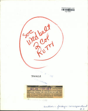 Author and authority (foreign correspondent, United State) on Israel Ruth Gruber visited Milwaukee Tuesday. She wore a suit she calls "my Arab, Jewish, Christian co-operation." Its material was made by Israelis. It was embroidered by Arab women in Bethlehem and designed by a Christian.
