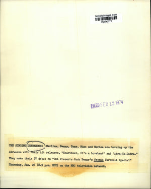 1974 Press Photo Singing Defrancos on RCA Presents Jack Benny's Second Special