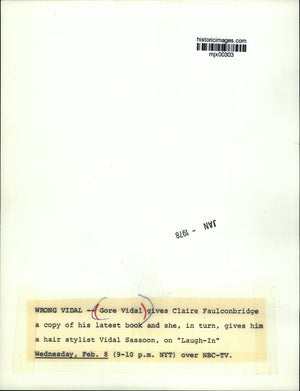 Gore Vidal gives Claire Faulconbridge a copy of his latest book and she, in turn, gives him a hair stylist Vidal Sassoon, on "Laugh-In", Wednesday, Feb. 8 (9-10 pm NYT) over NBC-TV.