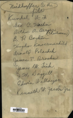 Niedhoeffer C.A.: Kunkel W.F., Geo O. Haehn, Arthur A. Berger (chairman), B.P. Boykin, Hugho Knoernschild, Arnold Polachek, James T. Brooks, James W. Lisk, J.H. Daggett, Edwin Wallaeger, Kenneth W. Jacobs Jr.