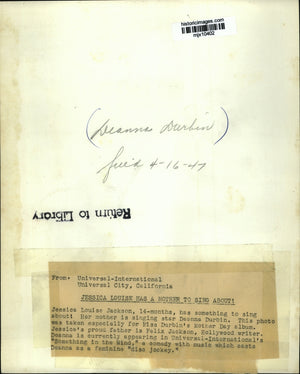 Jessica Louise Jackson, 14-months, has something to sing about! Her mother is singing star Deanna Durbin. This photo was taken especially for Miss Durbin's Mother Day album. Jessica's proud father is Felix Jackson, Hollywood writer. Deanna is currently appearing in Universal-International's "Something in the Wind" a comedy with music which casts Deanna as a feminine "disco jockey"