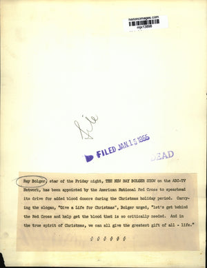 Ray Bolger spearheads American Red Cross blood drive. The star of the Friday night "the New Ray Bolger Show" on the American Broadcasting Company-television network, has been appointed by the Red Cross to urge added blood donors to give during the Christmas holiday period. Carrying the slogan, "Give a Life for Christmas," Bolger said, "Let's get behind the Red Cross and help get the blood that is so critically needed. And in the trud spirit of Christmas, we can all give the greatest gift of all--life."