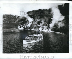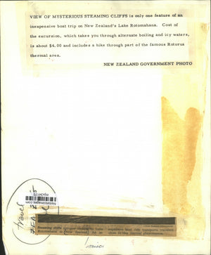 View of mysterious steaming cliffs is only one feature of an inexpensive boat trip on New Zealand's Lake Rotomahana. Cost of the excursion, which takes you through alternate boiling and icy waters, is about $4.00 and includes a hike through part of the famous Rotorua thermal area. misc.